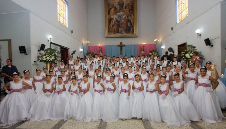 La Fundación Social JJ Pita organizó las primeras comuniones de 215 hijos de las asesoras comerciales de Apuestas Cúcuta 75. El padre Fabián Stapper ofició la ceremonia en la parroquia María Auxiliadora. La fundación entregó el ajuar completo.