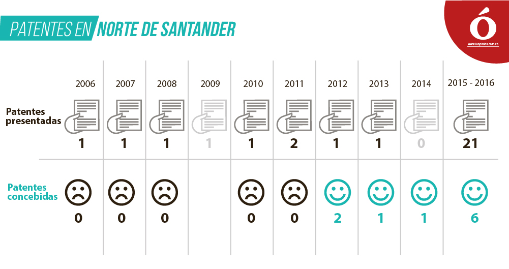 Durante el último año el departamento presentó 5 solicitudes de patente, cuatro de ellas de Cúcuta y una de Pamplona. En general, el país presentó 545.