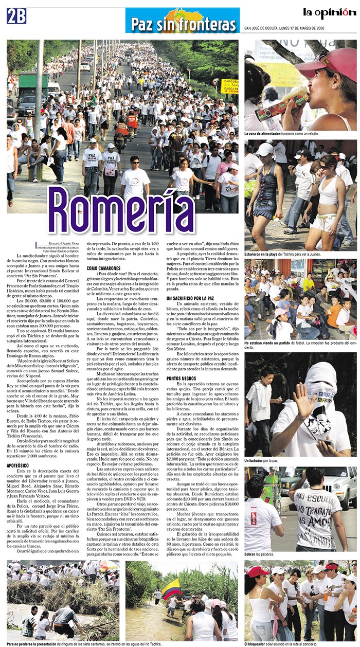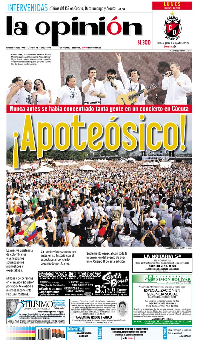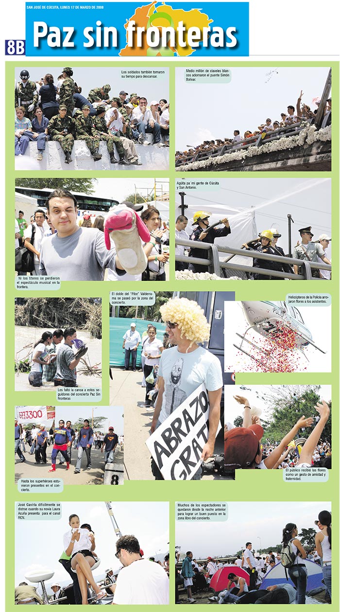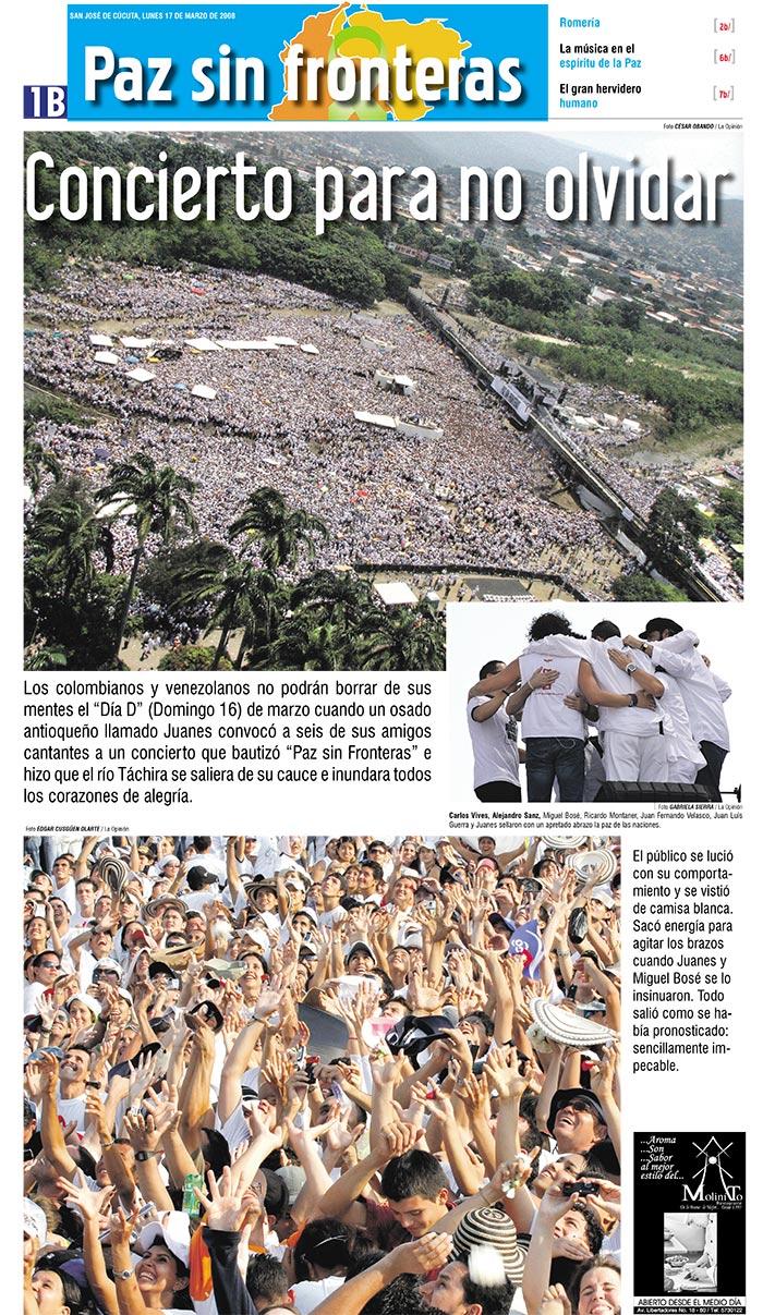 Además, contó con la presencia de más de 200 mil personas sobre el río Táchira. Pese a las altas temperaturas, el apoteósico concierto quedó como un hito histórico de la frontera y de Colombia. Lágrimas, sudor, saltos, gritos y sonrisas se tomaron el punto limítrofe bajo el sentimiento de la paz.