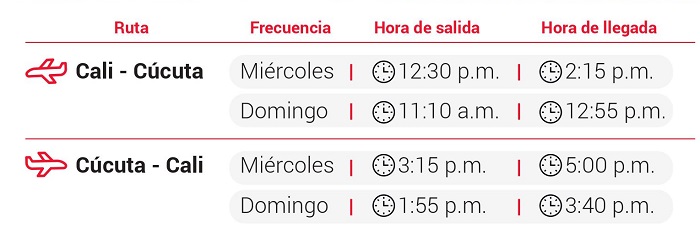 GCA Airlines asegura que Cúcuta es un importante mercado con gran potencial en demanda de vuelos y por ello inició esta ruta con la ventaja que en servicio y tiempo significa volar directo, sin tener que hacer escalas ni conexiones en Bogotá ni otras ciudades. Así, un viajero que para llegar de Cúcuta a Cali podía tardar entre siete y ocho horas, en los vuelos directos de GCA Airlines tarda menos de dos horas. GCA Airlines ha puesto al servicio de los pasajeros de Cúcuta dos frecuencias semanales, así: Cali-Cúcuta, los miércoles las salidas serán a las 12:30 pm con hora de llegada 2:15 pm; los domingos saldrán a las 11:10 am con llegada 12:55 pm. Cúcuta-Cali: los miércoles salen a las 3:15 pm con llegada a las 5:00 pm y los domingos parten a la 1:55 pm y arriban a las 3:40 pm.