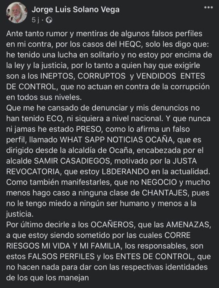 Agregó que “en dicho proceso disciplinario, adelantado por la Procuraduría Segunda Delegada para la Contratación Estatal, las decisiones provisionales de suspensión del cargo y prórroga de la suspensión del cargo, no se tomaron con base en solicitud, queja o denuncia del señor Jorge Solano Vega. De allí que sea innecesario e injusto que en la nota sobre el homicidio se entrelace la misma con el video y la investigación y suspensión del ejercicio de mi cargo como gerente del hospital de Ocaña”.