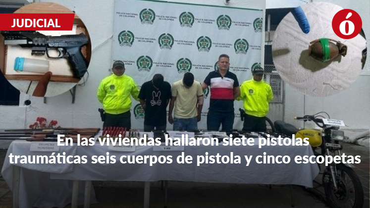 En las viviendas hallaron siete pistolas traumáticas que, al parecer, estaban siendo modificadas para aumentar su letalidad; seis cuerpos de pistola y cinco escopetas. Además, incautaron un número considerable de munición: 550 cartuchos calibre 38 milímetros, 100 cartuchos calibre 28, 49 cartuchos calibre 22, 13 cartuchos calibre 12, 37 cartuchos calibre 9 milímetros para arma traumática y nueve cartuchos calibre 12 para arma traumática. También encontraron una granada.