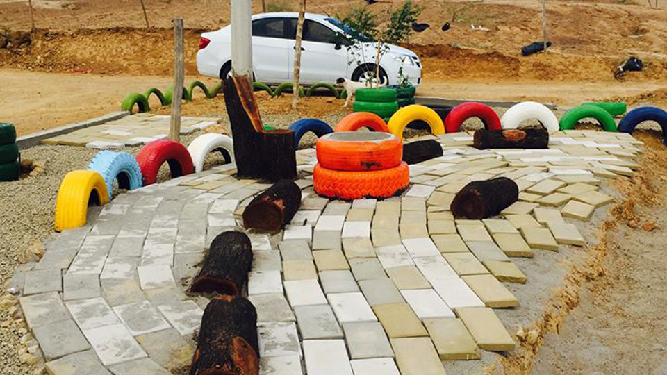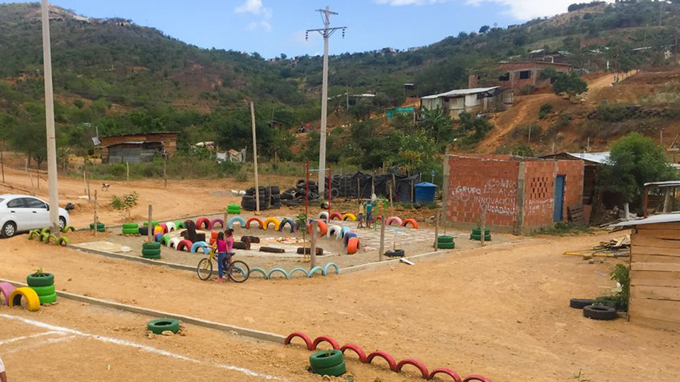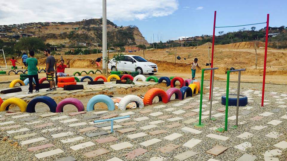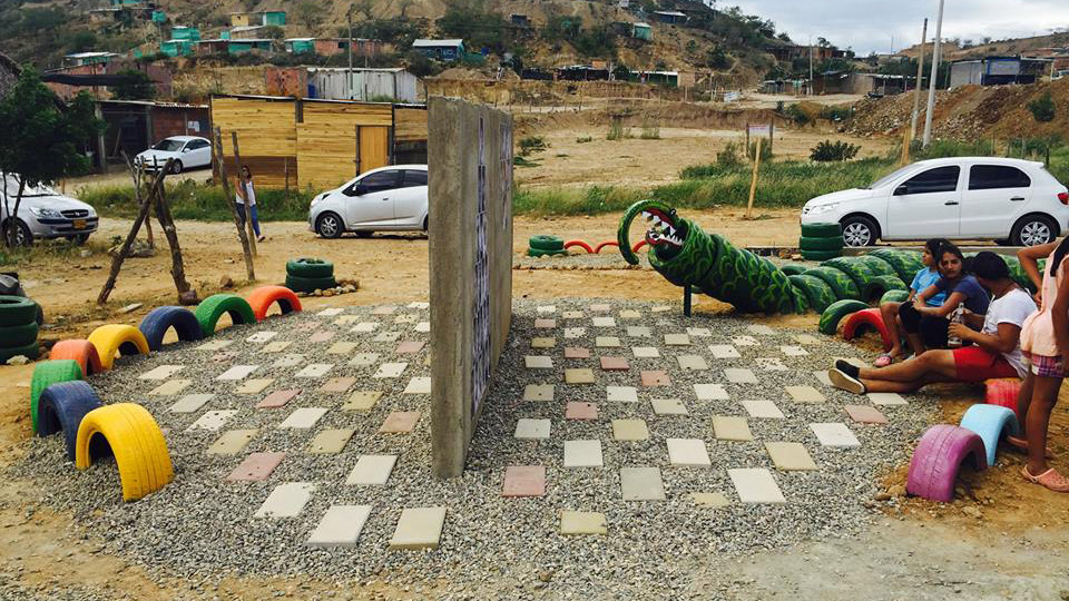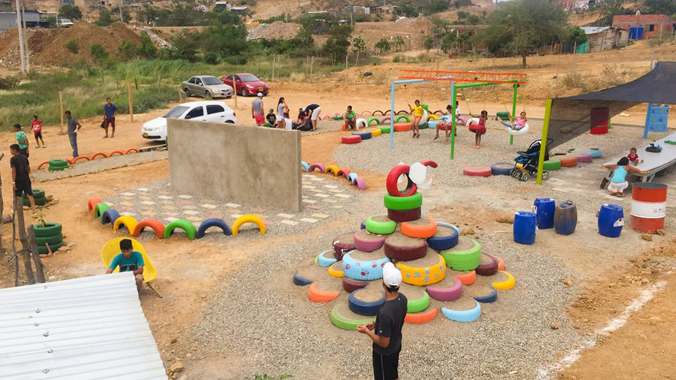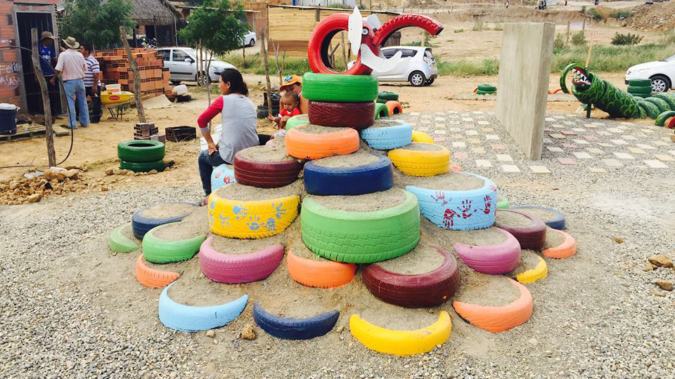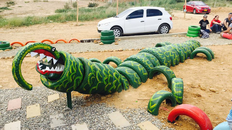 En total se intervinieron 950 metros cuadrados con material reutilizado, especialmente llantas viejas de carros. Se plantaron 80 árboles, se adecuó una cancha de microfútbol, se elaboró un mural en cerámica y se dispuso un espacio para los juegos infantiles, que también se elaboraron con materiales reciclables y chatarra.