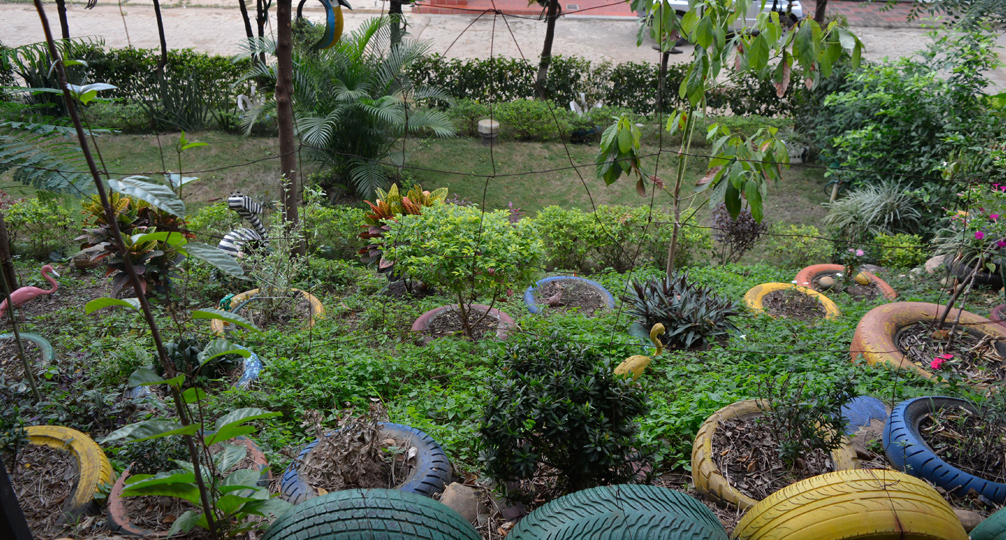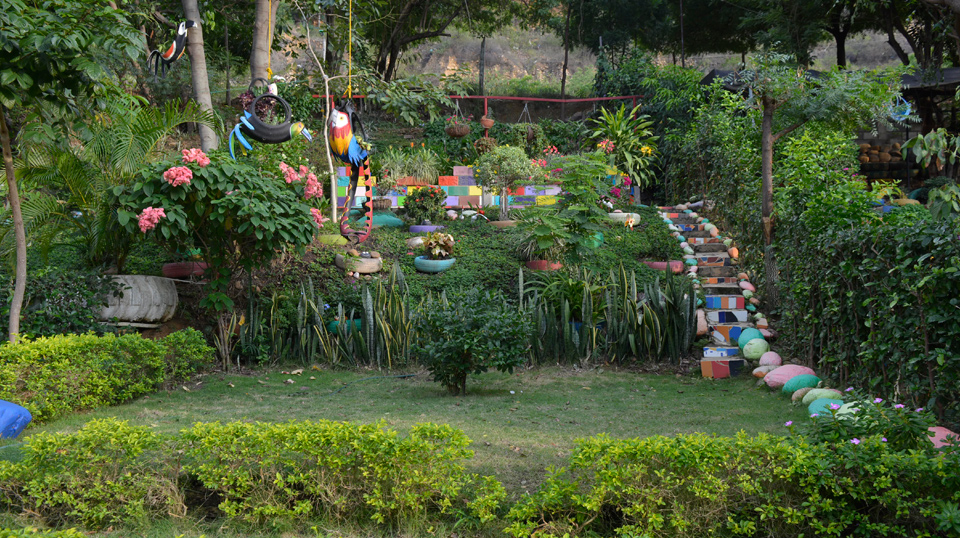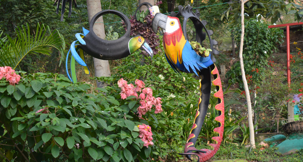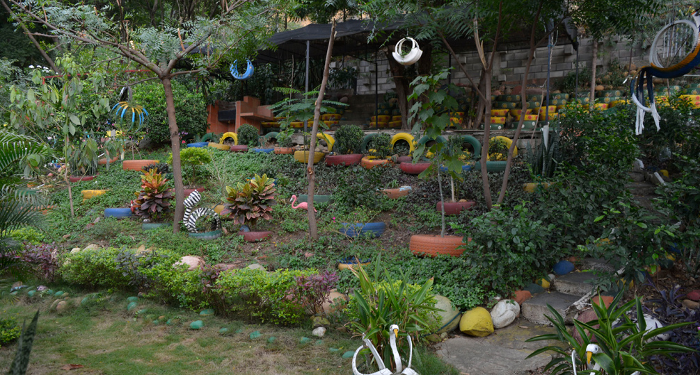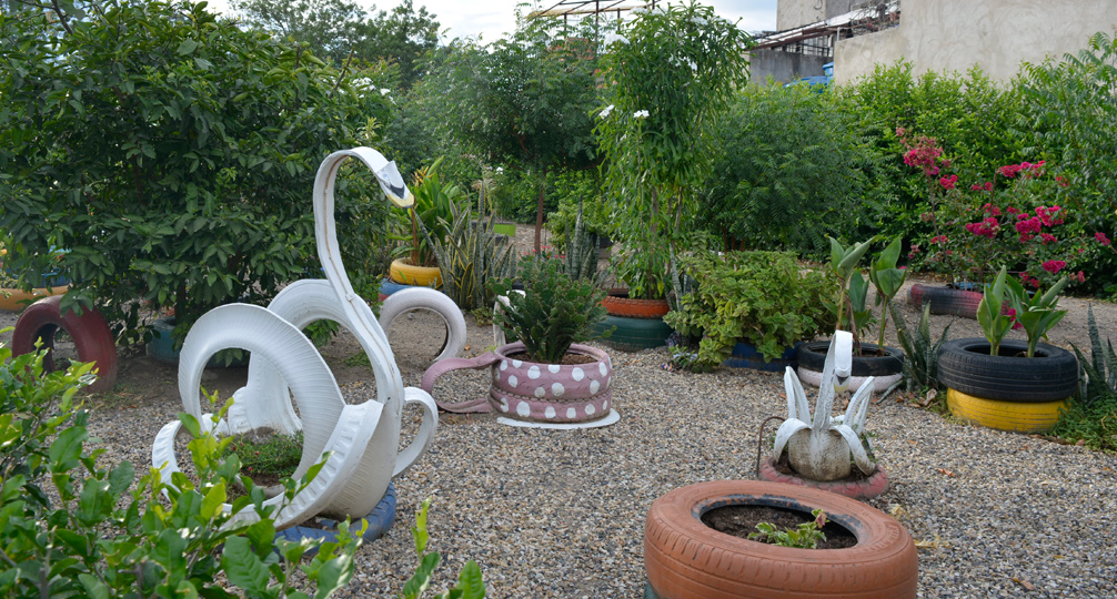 En el barrio Nuevo Escobal, son tres las madres de familia las que se encargan de mantener un parque que cuenta con diferentes plantas y animales hechos con llantas de carros.
