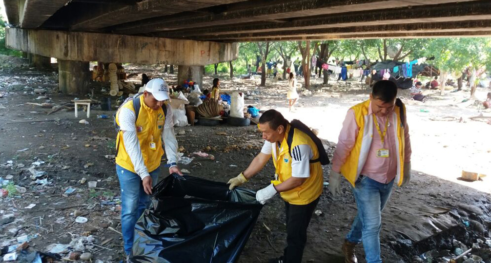 Delegados de la secretaría de Salud de Cúcuta, la secretaría municipal de Gestión del Riesgo y entidades de aseo, entre otros, coordinaron una jornada de limpieza bajo el puente internacional Francisco de Paula Santander, con el fin de reducir los riesgos sanitarios para los pobladores del pueblo Yukpa que permanecen desde hace un mes bajo esta estructura, en medio de basuras.