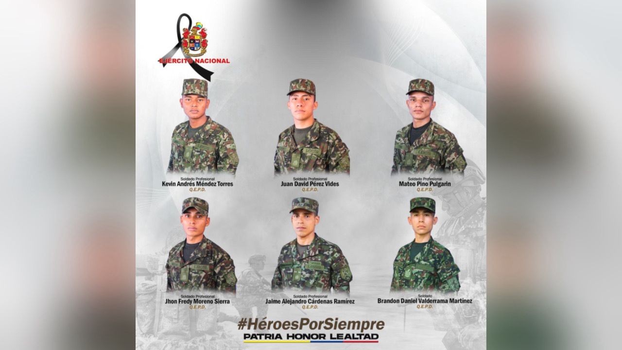 En total son siete soldados muertos y más de 30 heridos. Los soldados muertos fueron identificados como Jaime Alejandro Cárdenas Ramírez, Mateo Pino Pulgarín, Juan David Pérez Vides, Kevin Andrés Méndez Torres, Jhon Fredy Moreno Sierra y Daniel Valderrama Martínez. El último soldado fallecido aún no ha sido identificado.