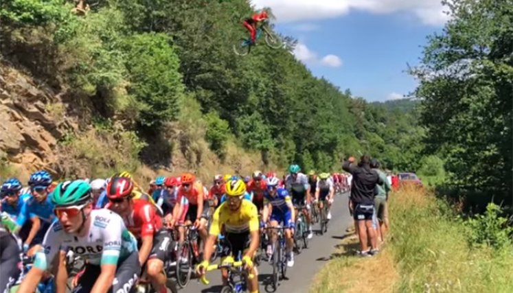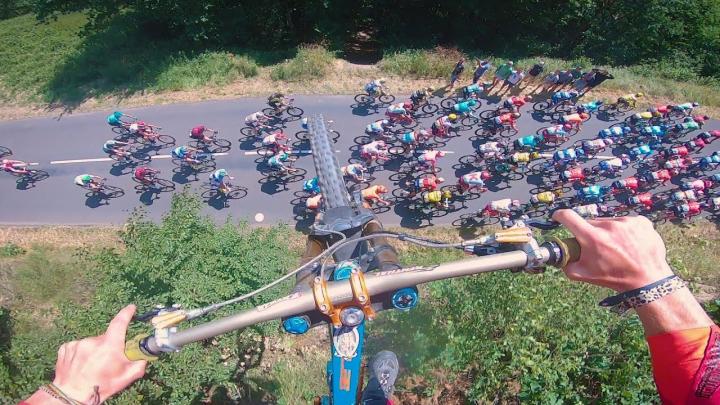 Ese día, un osado ciclomontañista galo, llamado Valentin Anouilh, saltó desde un barranco y pasó por encima del pelotón.
