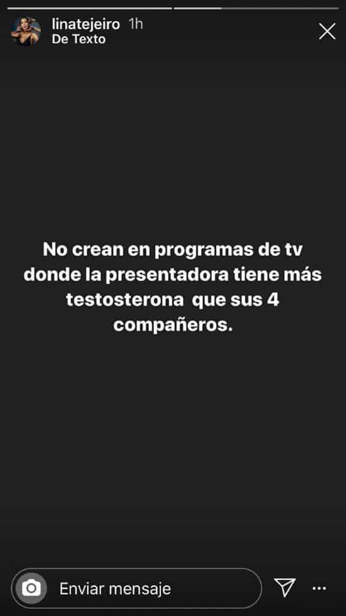 Ante esto, Tejeiro publicó una historia con un contundente mensaje en el que se refirió al programa de chismes de Caracol, manifestando: “No crean en programas de TV donde la presentadora tiene más testosterona que sus 4 compañeros”, fueron las palabras de Tejeiro.