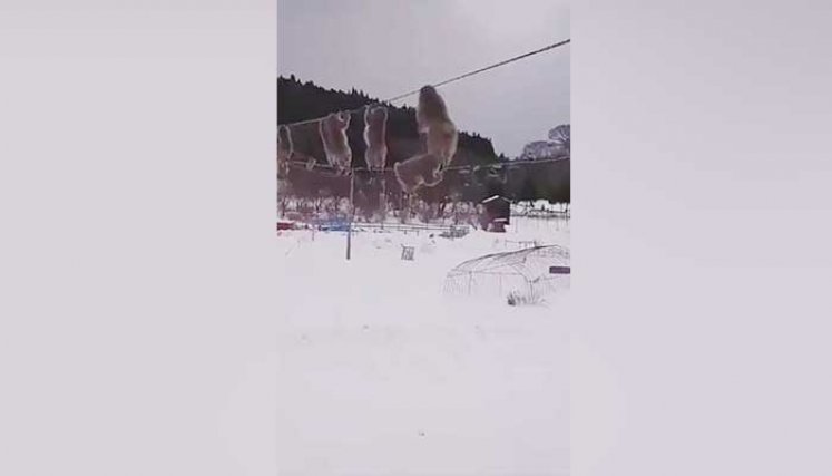 El video que muestra el balance de un grupo de monos que caminan a lo largo de cables eléctricos en el norte de Japón se ha vuelto viral.