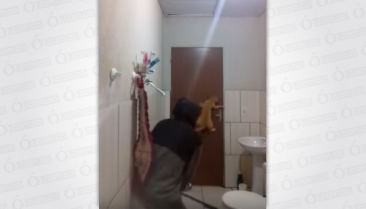 El adolescente, armado con lo que parece ser un limpiavidrio, intentó sacar el ratón que se escondía detrás del lavamanos, pero cuando lo logró su reacción fue inesperada.