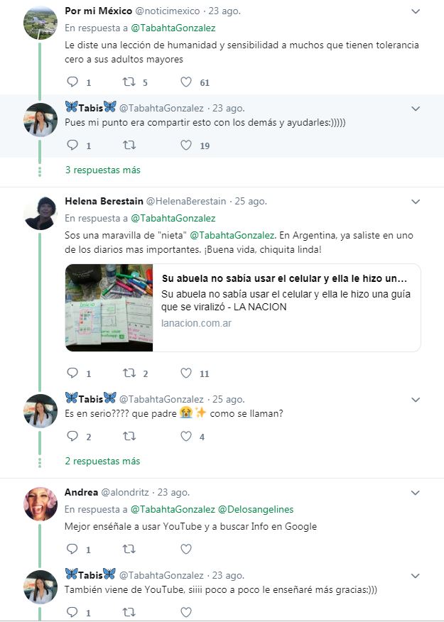 En su cuenta, tras el impacto de su publicación, comentó “Jamás me imaginé que mi tweet iba a ayudar a mucha gente y que les gustara, ya que no soy nada experta y lo hice con mucho cariño para mi abuelita. Estoy muy feliz en serio, muchas gracias por su buena vibra”.