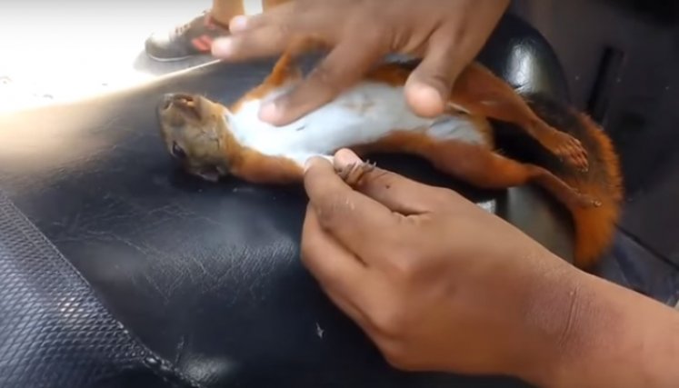 El hombre no deja en ningún momento de reanimar a la ardilla y en un momento también le abre la boca intentando que ingrese un poco de aire. Después de unos minutos, este animal empieza a reaccionar y los acompañantes de esta tierna travesía aseguran que “está volviendo”.