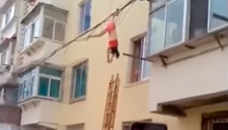 Testigos grabaron a esa mujer colgando de uno cables. Según se conoció después, la protagonista de la historia terminó enredada allí luego de intentar huir por ella ventana de una casa. ¿De quién se escondía? Nada más y nada menos que de la esposa de su amante.