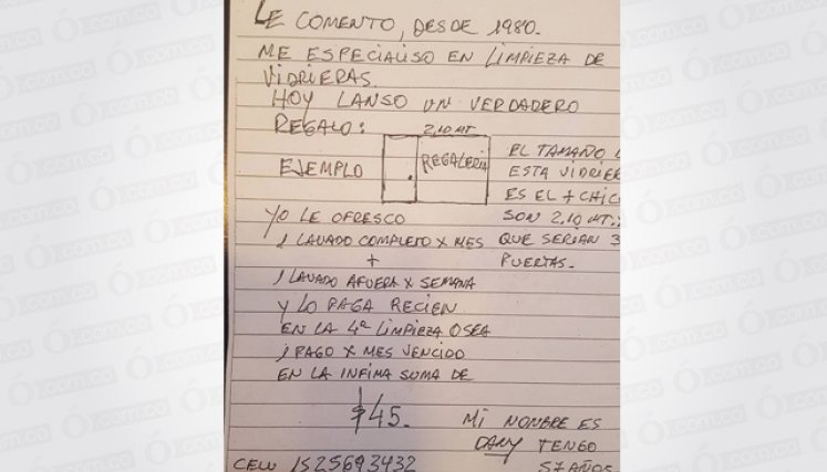 “Le comento, desde 1980 me especialiso en limpieza de vidrieras. Hoy lanso un verdadero regalo: yo le ofresco 1 lavado completo x mes + 1 lavado afuera por semana y lo paga recien en la 4° limpieza. O sea 1 pago x mes vencido en la infima suma de $ 45 (sic)", decía el texto.