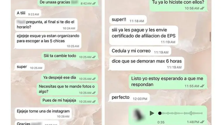 La estrategia se basó en la confianza interpersonal. Andrea*, una psicóloga y bailarina de 27 años afectada por el fraude, explicó a este medio que la oferta no llegó por un desconocido, sino a través de su círculo cercano. “El modus operandi que ellos tienen es contactar bailarinas para que ellas mismas recluten a las otras bailarinas”, relató. Su amiga, quien también fue engañada, le aseguró que buscaban perfiles para un trabajo de la Alcaldía. Una vez contactadas, las víctimas ingresaban a un grupo de WhatsApp donde “Julián” solicitaba documentos habituales: copia de la cédula, fotografías de rostro y cuerpo completo, y medidas de tallaje. El punto de quiebre llegaba con la afiliación a la ARL (Administradora de Riesgos Laborales).