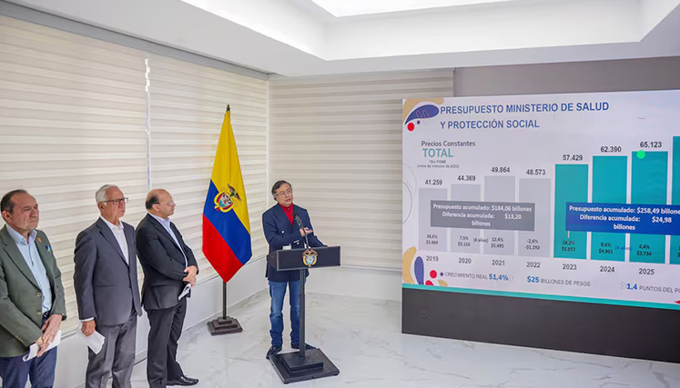 En materia de salud, el presidente Gustavo Petro afirmó que el presupuesto del sector para 2026 será financiado mediante el decreto de emergencia económica, argumentando que Colombia cuenta actualmente con el mayor presupuesto en salud de su historia. Según el jefe de Estado, durante su mandato se han invertido $258,4 billones en este sector, lo que representa una diferencia acumulada de $24,98 billones frente al gobierno del expresidente Iván Duque.
