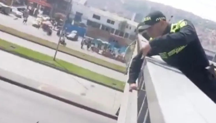 Un video de cámaras de seguridad registró el momento en que un subintendente de la Policía Nacional evitó que una mujer se lanzara desde un puente peatonal en la Terminal del Sur de Bogotá, en la localidad de Bosa.