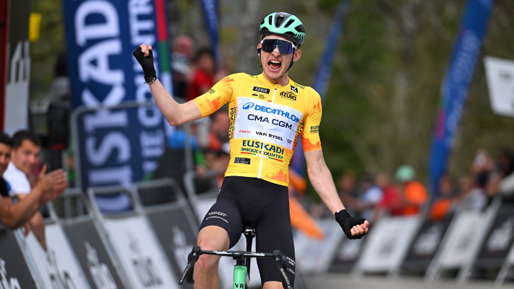 El joven francés, de 19 años y que ha celebrado tres triunfos en esta 65a edición de la ronda vasca, volvió a ofrecer una muestra de confianza y valentía con un ataque bajo la lluvia a 50 kilómetros de meta, en el segundo paso por Elosua, en el que dejó atrás al alemán Florian Lipowitz, el esloveno Primoz Roglic (Red Bull-BORA-hansgrohe) y el resto de rivales.