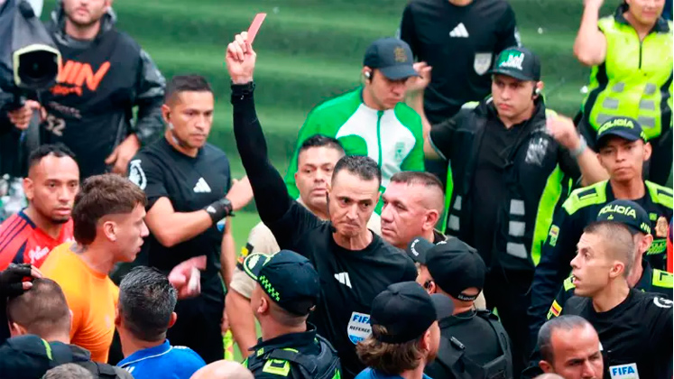 Al final, cuando Aguerre llegó a la parte de abajo del camerino y el árbitro antioqueño Wilmar Roldán logró acercarse a los implicados en la situación, le sacó tarjeta roja a Aguerre, así como a Mateus Uribe. También se ve, en las fotos, se observa a Roldán recibiendo el reclamo de jugadores como “Chipi Chipi” Castillo, William Tesillo y David Ospina, tras mostrar la amonestación.
