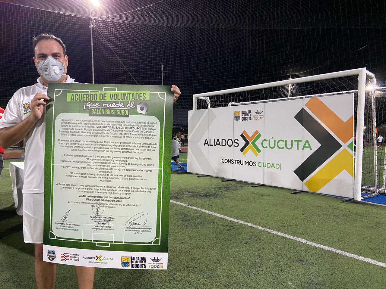 Ante las insistentes peticiones de los dueños de complejos deportivos en la ciudad, el alcalde Jairo Yáñez, en compañía del Presidente Ejecutivo de la Cámara de Comercio de Cúcuta, Sergio Andrés Entrena, y el comandante de la Policía Metropolitana de Cúcuta, coronel José Luis Palomino, dieron el visto bueno a la reactivación de las canchas sintéticas bajo un acuerdo de voluntades con el que se busca garantizar la apertura segura de este sector deportivo.