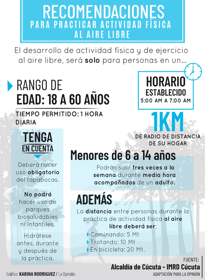 Sin embargo, a partir del pasado lunes 27 de abril, el Gobierno Nacional autorizó que los colombianos de 18 a 60 años puedan ejercitarse al aire libre en horas de la mañana, por un periodo máximo de una hora, en un radio de un kilómetro de distancia de sus residencias.