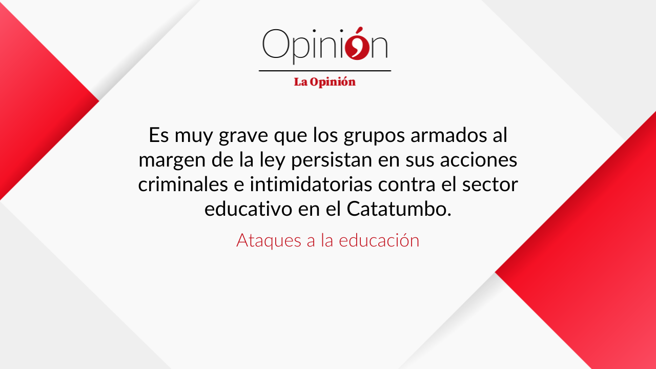 Teniendo en cuenta que los dos grupos que están enfrascados en el conflicto por apoderarse del territorio catatumbero han estado o se encuentran en procesos de conversaciones con el Gobierno nacional, debería la ‘Paz Total’ imponer inamovibles fijos, como el de no tolerar ni admitir y siempre denunciar cualquier ataque en contra del sector educativo.