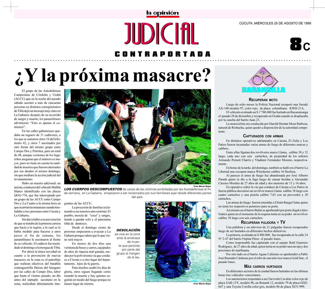 Lo masacre ocurrida el corregimiento La Gabarra de Tibú, Norte de Santander, el 21 de agosto de 1999, tuvo su antesala en mayo de ese año, cuando el día sábado 29 ingresaron camiones con más de 300 integrantes de las Autodefensas Unidad de Colombia (Auc) y asesinaron a 15 habitantes, luego de ser sindicadas de colaboradores e informantes de la guerrilla.