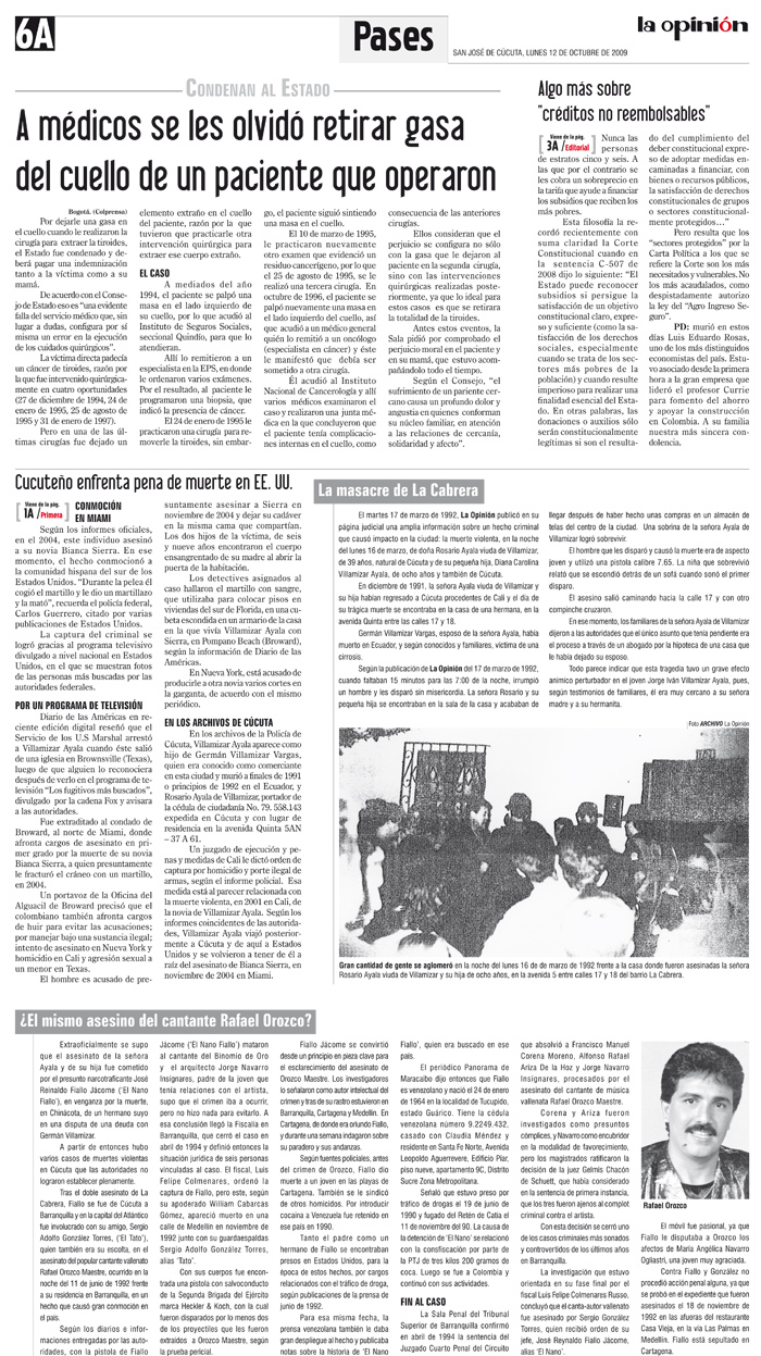 Recordar el asesinato del cantante vallenato Rafael Orozco Maestre, ocurrido el 11 de junio de 1992, en la entrada de una vivienda ubicada en la calle 96 con carrera 49C, de Barranquilla, también es traer a colación el homicidio de Rosario Ayala viuda de Villamizar, de 39 años, y de su pequeña hija, Diana Carolina Villamizar Ayala, de 8, que se presentó en el barrio La Cabrera, de Cúcuta, ese mismo año pero en diferente fecha, el 16 de marzo.