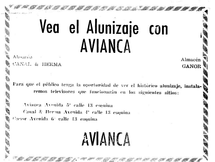 ‘Vea el alunizaje con Avianca’, señaló ese aviso, precisando que colocó televisores en la esquina de la calle 13 con avenida 5, en la calle 13 con avenida 4 y en la esquina de la calle 13 con avenida 6.