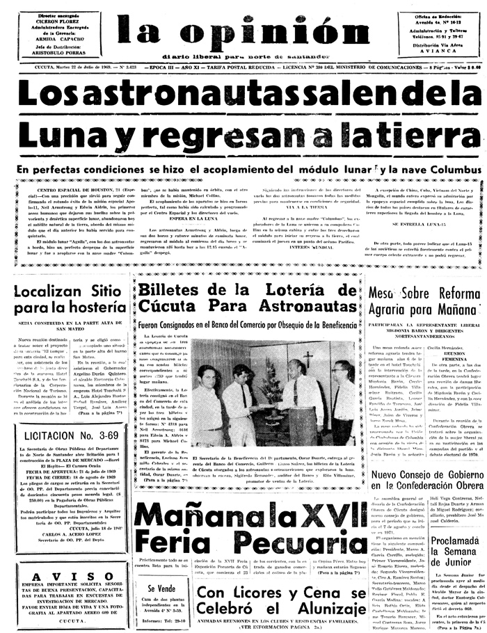 El martes 22 de julio de 1969, La Opinión dio a conocer una información local en torno al viaje espacial. Resulta que la Lotería de Cúcuta decidió dar a la tripulación del Apolo 11, como obsequio, tres billetes del sorteo que se desarrollaría el siguiente día.