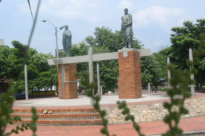 Este monumento tiene dos estatuas, una del Libertador Simón Bolívar, donada por el rector de la Universidad Simón Bolívar, Dr. Tomás Wilches Bonilla, y la otra, del general Francisco de Paula Santander, entregada por la Gobernación.