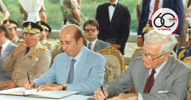 Los presidentes Carlos Andrés Pérez (Venezuela) y Virgilio Barco (Colombia) firman la declaración de Ureña, en marzo de 1989.