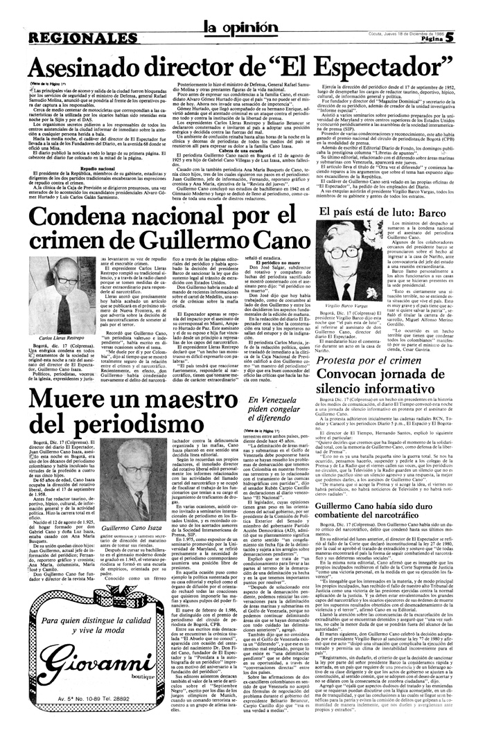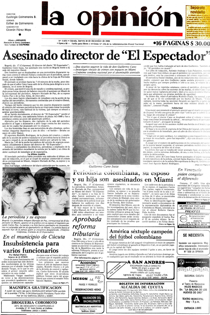 La muerte de Guillermo Cano Isaza, director del diario El Espectador, enlutó no solo al periodismo colombiano, sino a todo un país sumido en una guerra interna de paramilitares, guerrilleros y narcotraficantes.