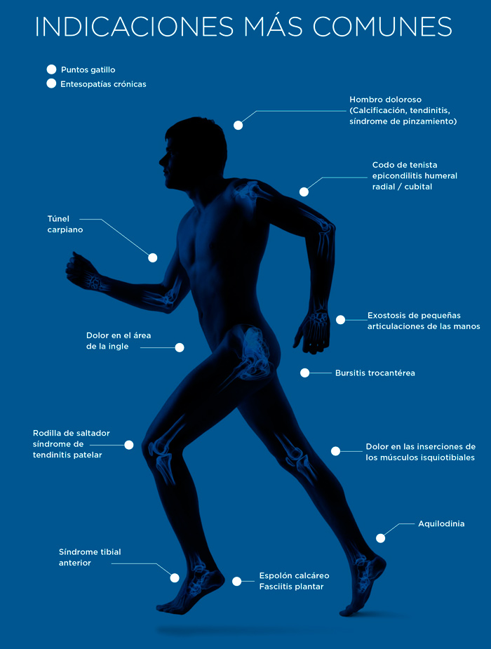 Esta energía, que es generada por un compresor de aire y llega por medio de un transmisor, promueve la regeneración y procesos reparativos de los tendones, músculos y otras estructuras blandas mejorando en esta forma la inflamación crónica y aliviando el dolor que no responde a los tratamientos convencionales.