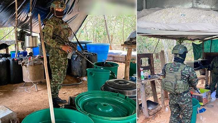“Las tropas incautaron 1.752 galones de insumos químicos líquidos, entre ellos acetona y ácido clorhídrico, así como 800 kilos de insumos sólidos, incluyendo soda cáustica y carbón activado; además de equipos y maquinaria especializada, como sistemas de destilación, prensas hidráulicas, hornos microondas y otros elementos utilizados en el procesamiento del alcaloide”, detalló la institución.