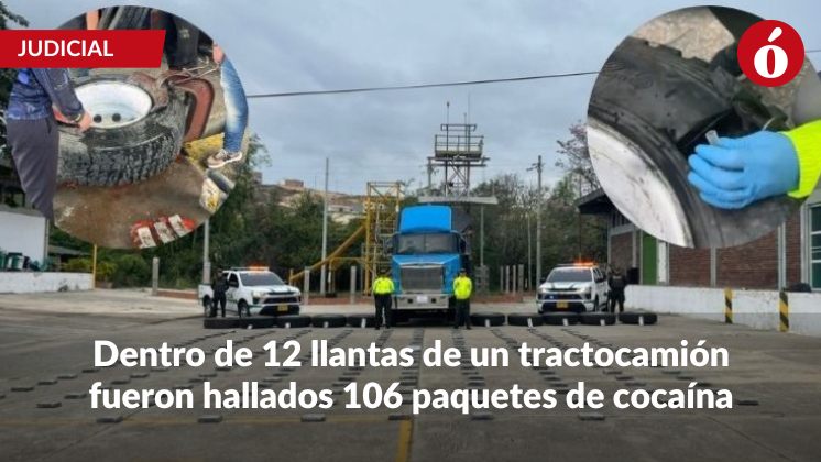 Dentro de 12 llantas de un tractocamión fueron hallados 106 paquetes de cocaína, cada uno con un kilo de la sustancia. El hecho ocurrió en Ocaña, donde los uniformados detuvieron el vehículo, azul, que transportaba la droga.