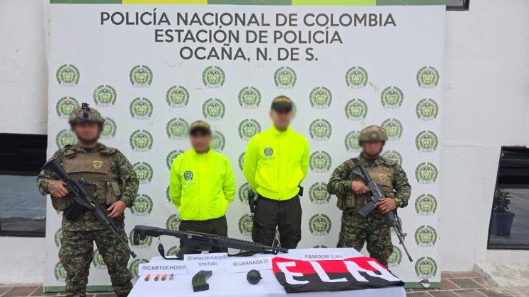 En el barrio La Pesebrera del municipio de Ocaña, policías realizaron la incautación de una granada de aturdimiento, un fusil, calibre 12 milímetros, un proveedor, cuatro cartuchos y una bandera alusiva al Eln.