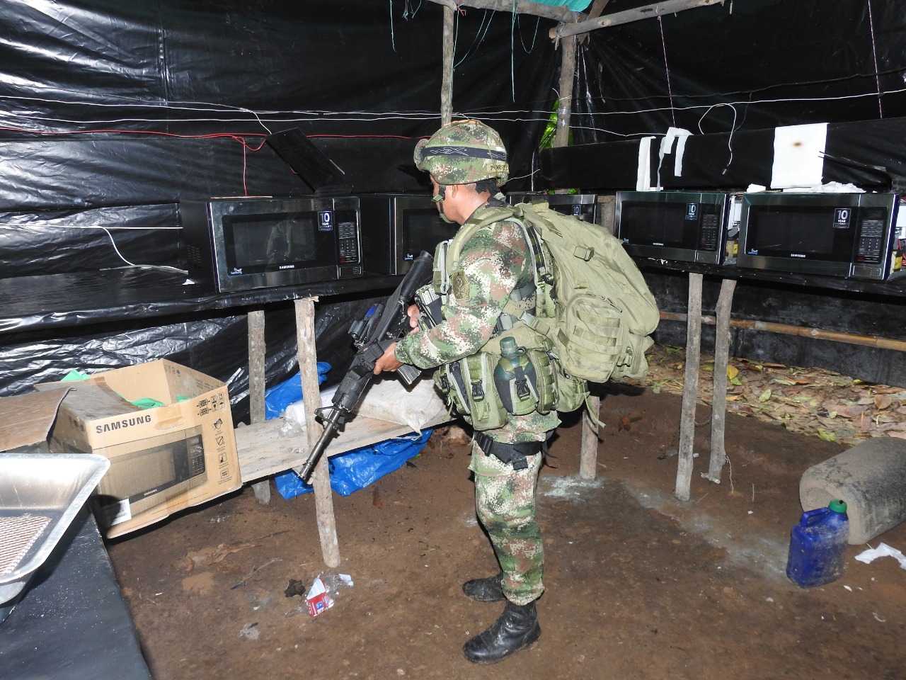 De acuerdo con el Ejército, las estructuras pertenecientes al frente 33 de la desmovilizada guerrilla se encontraban en la vereda Angalia, las cuales almacenaban 1.045 galones de gasolina, 859 de cetona, 177 galones de ácido sulfúrico, 80 de ácido clorhídrico y 66 galones de Aceite Combustible Para Motores (ACPM).