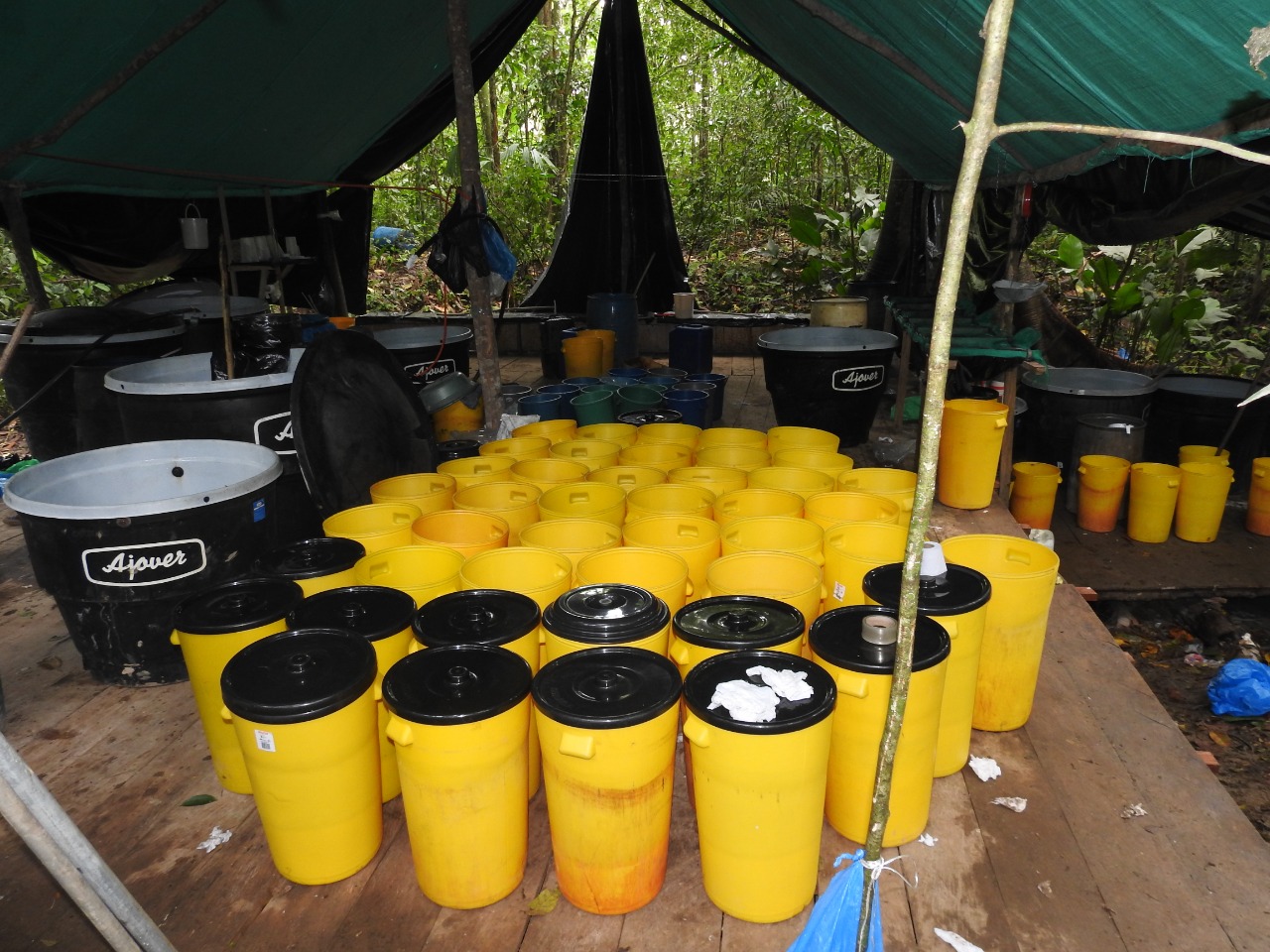 Las tropas de la Fuerza de Tarea Vulcano, con apoyo del Brigada Contra el Narcotráfico del Ejército, de la Fuerza Aérea Colombiana y la Policía Nacional, también decomisaron 2.500 kilos de cloruro de calcio, 100 de soda caustica, 100 de metabisilfito y 50 kilos de carbón, sustancias empleadas en la fabricación de cocaína.