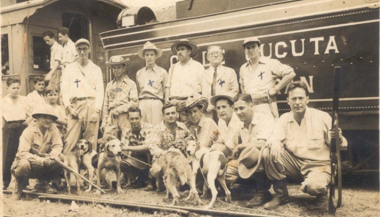 Algunos miembros del Club de Caza y Pesca de Cúcuta posan frente al vagón del ferrocarril llamado Justo L Durán en el cual se trasportaban a su excursión seguramente hacia la zona de Puerto Santander, acompañados de sus armas y sus perros de cacería, por allá al final de la década del 50.