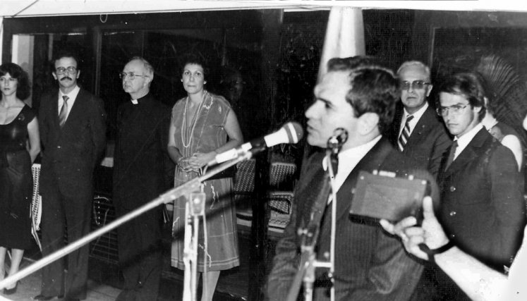 En ella recordamos de izquierda a derecha a Pilar García Herreros, Helí Abel Torrado, monseñor Pedro Rubiano Sáenz, Obispo de la época, Margarita Silva de Uribe, Gobernadora, Juan Pabón en su disertación, Álvaro Villamizar Suárez, Jaime Buenahora Febres y el periodista Fersales, con la grabadora de la época.
