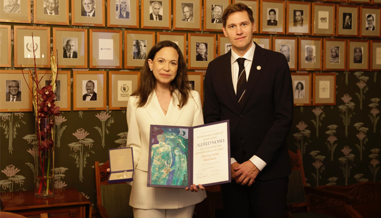 María Corina Machado, laureada con la Paz de este año, se ha visto obligada a vivir en la clandestinidad. Recibió el Premio Nobel de la Paz por su labor en la promoción de los derechos democráticos del pueblo venezolano. Sin embargo, logró realizar el difícil y peligroso viaje de Venezuela a Noruega, llegando ayer a Oslo para recibir su Premio Nobel de la Paz. Aquí finalmente aparece junto a Jørgen Watne Frydnes, presidente del Comité Noruego del Nobel, con su diploma y medalla del Premio Nobel.