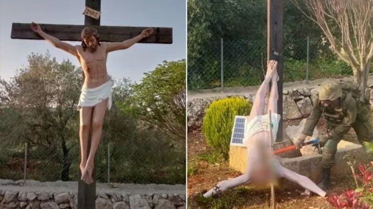 La imagen en cuestión, que el Ejército verificó en una investigación inicial, muestra a un soldado israelí armado con un martillo y golpeando la cara de Jesús crucificado. La figura, además, había sido descolgada del mástil y se encontraba invertida en el suelo fuera de la iglesia.