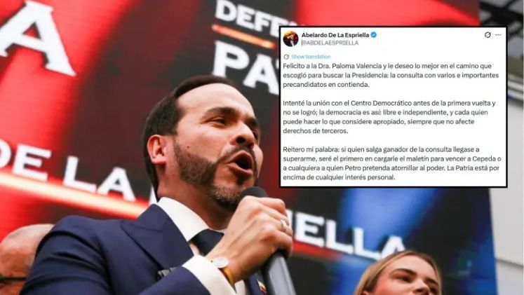 Abelardo de la Espriella felicitó a Paloma Valencia y le deseó “lo mejor en el camino que escogió para buscar la Presidencia”, después de que esta anunciara que participará en la “Gran Consulta por Colombia”. Sin embargo, en ese mismo pronunciamiento, recordó que previamente intentó “la unión con el Centro Democrático antes de la primera vuelta y no se logró”. De la Espriella, aseguró que: “la democracia es así: libre e independiente, y cada quien puede hacer lo que considere apropiado, siempre que no afecte derechos de terceros”.
