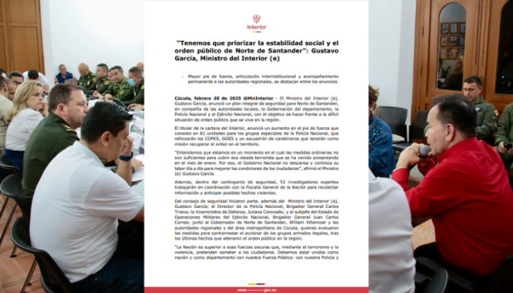 El Gobierno Nacional anunció un plan integral de seguridad liderado por el Ministro del Interior Gustavo García. La estrategia se planteó en medio del consejo de seguridad presidido por el gobernador de Norte de Santander, William Villamizar.