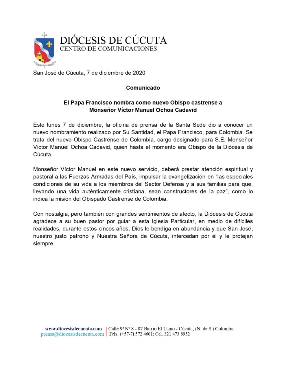 Se trata del nuevo Obispo Castrense, cargo designado al monseñor Victor Manuel Ochoa Cadavid, quien hasta el momento se venía desempeñando como Obispo de la Diócesis de Cúcuta desde el 15 de agosto de 2015.