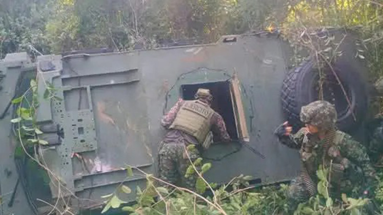 Uno de esos vehículos blindados, un Hunter XL diseñado para el transporte de tropas, estaba retrocediendo por un camino veredal, cuando el borde de la carretera se desbarrancó, provocando que rodara al vacío.