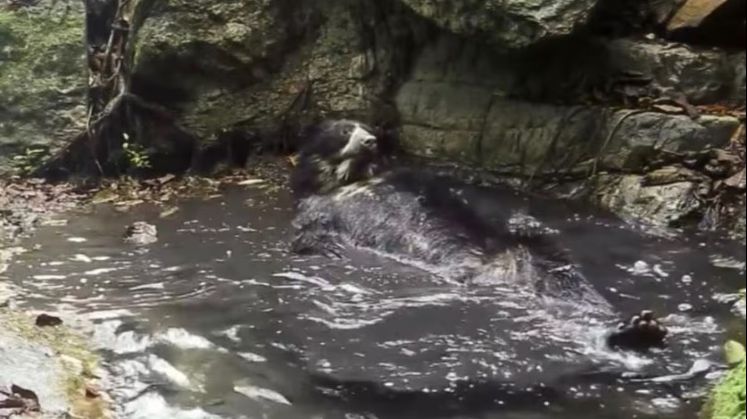 Un oso de anteojos fue captado mientras se daba un baño en un río, en un video que rápidamente se hizo viral en redes sociales por lo inusual y llamativo de la escena.