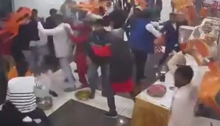 El descontento escaló en segundos: algunos asistentes comenzaron a discutir, luego se empujaron y finalmente estalló una pelea generalizada. En las imágenes se observa a familiares y amigos golpeándose con sillas, lanzando puñetazos y hasta tirando la comida al suelo.
