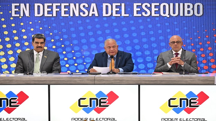 "La decisión que ustedes han tomado da un empuje vital poderosísimo (...). Ahora sí vamos a recuperar los derechos de Venezuela históricos en la Guayana Esequiba, ahora sí vamos a hacer justicia, ahora sí vamos a reivindicarnos con la fuerza de todos", expresó el gobernante socialista en un acto junto a la directiva del Consejo Nacional Electoral (CNE).